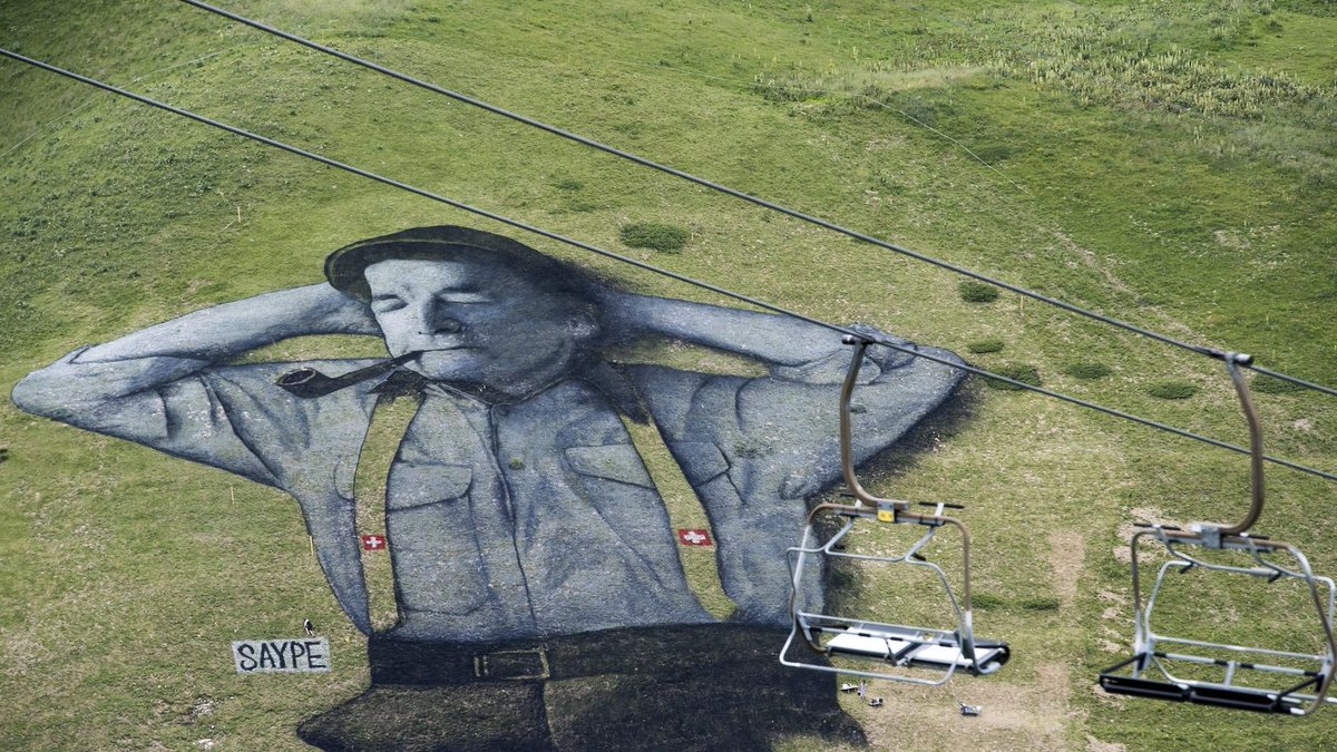 TRIBUNTRAVEL.COM - Seorang seniman Perancis Saype membuat sebuah lukisan biodegradable di gunung yang berada di atas Resort Leysin, Swiss.