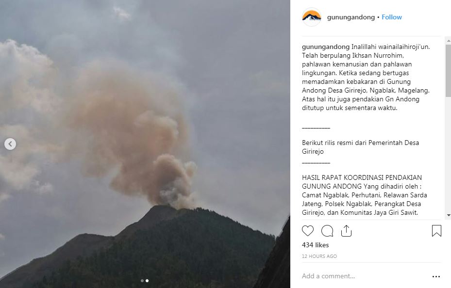 Ketika sedang bertugas memadamkan kebakaran di Gunung Andong Desa Girirejo, Ngablak, Magelang," informasi yang tertulis dalam akun Instagram @gunungandong.