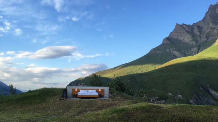 Hotel di pegunungan Alpen ini hanya menyediakan double bed berikut dengan lampu tidur dan meja kecil sebagai fasilitas.