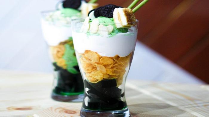Parfait adalah hidangan yang terdiri dari Jelly, cornflake, wipe cream, ice cream, poki, oreo, soft cake, dll.