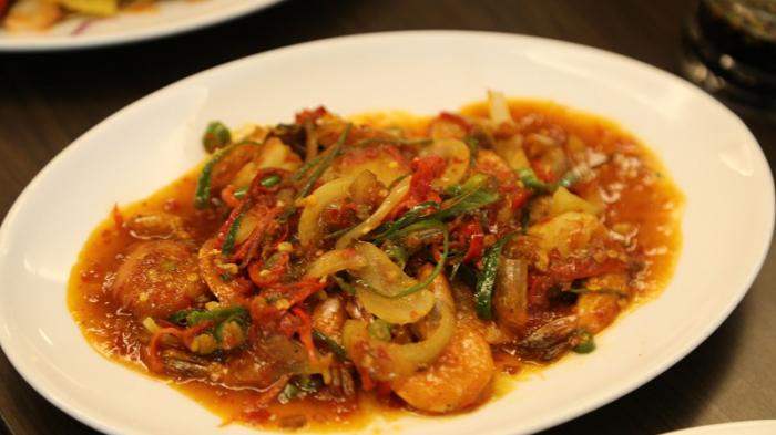 Menu satu ini terbuat dari bahan dasar udang kulit belah yang bisa dinikmati bersama saos khusus dengan cita rasa gurih pedas dikombinasikan dengan nasi putih hangat.