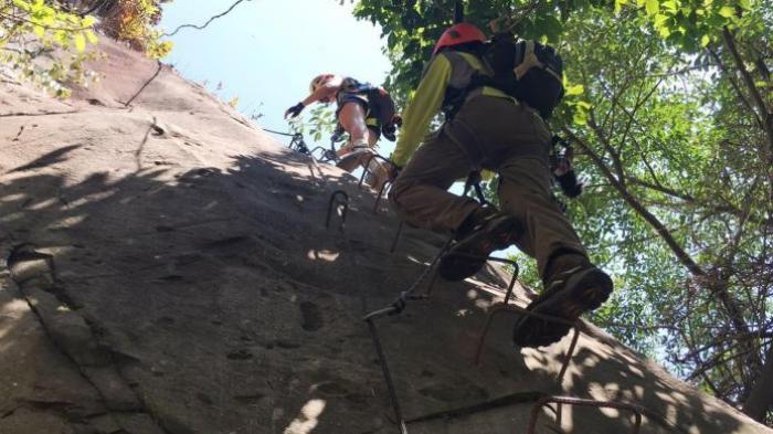 Soalnya jalur yang harus dilewati berupa tangga besi yang ditanam di sepanjang dinding tebing.
