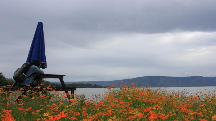Ada ratusan bunga tulip yang menghiasi area pinggiran Danau Toba yang berpasir putih tersebut.