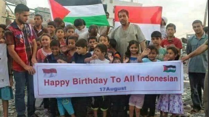 Yang paling menarik adalah, foto yang diunggah oleh beberapa akun di sosial media yakni foto ucapan selamat merayakan hari kemerdekaan dari warga Palestina.