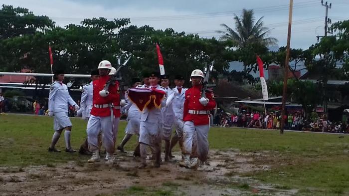 Penurunan bendera, Rabu (17/8/2016) harus berlinang lumpur dikarenakan lapangan yang diguyur hujan dengan intensitas tinggi.