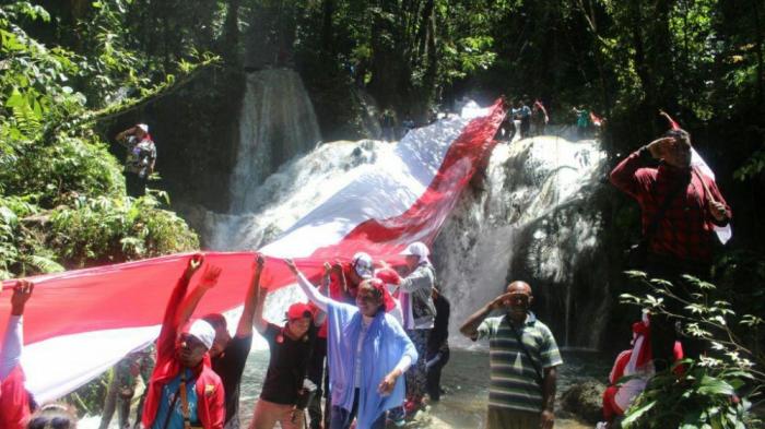 TRIBUNTRAVEL.COM - Sekelompok pemuda pecinta alam beserta tim gabungan kepolisian dan Basarnas Nabire melaksanakan pengibaran bendera di Air Terjun Bihewa, Desa Legari, Distrik Makimi, Kabupaten Nabire, Papua, Rabu (17/8/2016).