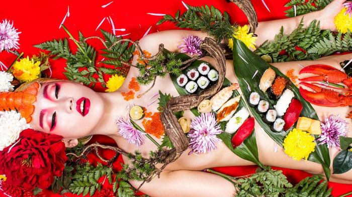 Sushi dan shasimi yang diletakkan di atas tubuh wanita tanpa sehelai pakaian pun.