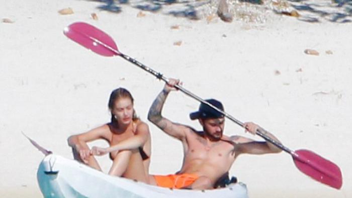Gigi hanya mengenakan bikini dan Zayn terlihat mengunakan celana pendek.