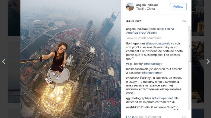 Beberapa kali Angela Nikolau juga meminta seseorang untuk memotret dirinya saat melakukan pose di atas gedung pencakar langit.