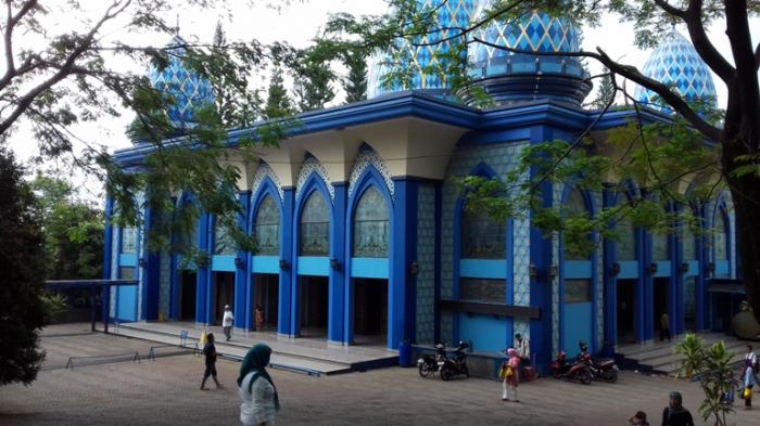 Sesuai dengan namanya, masjid yang dibangun di atas tanah seluas sekitar 1,5 hektare ini didominasi cat warna biru.