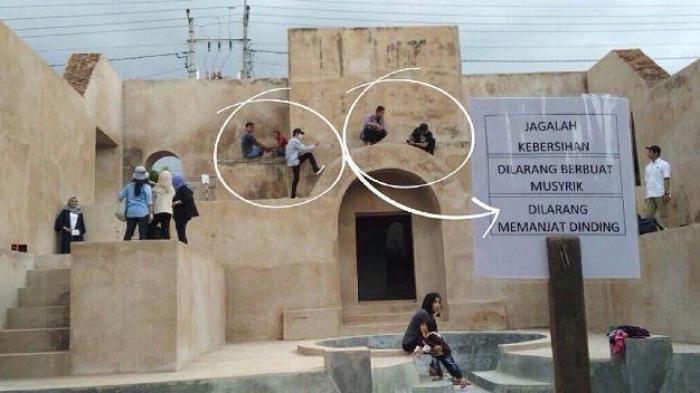 Padahal di lokasi itu sudah jelas tertulis larangan memanjat dinding yang terpampang di sebuah papan.