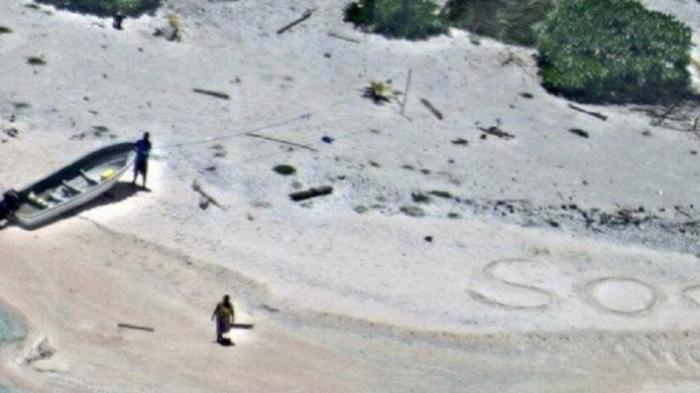 Tulisan SOS di pasir pantai di sebuah pulau terpencil di Mikornesia, Samudera Pasifik, berhasil menjadi pentunjuk bagi upaya penyelamatan sepasang pria dan wanita ini.