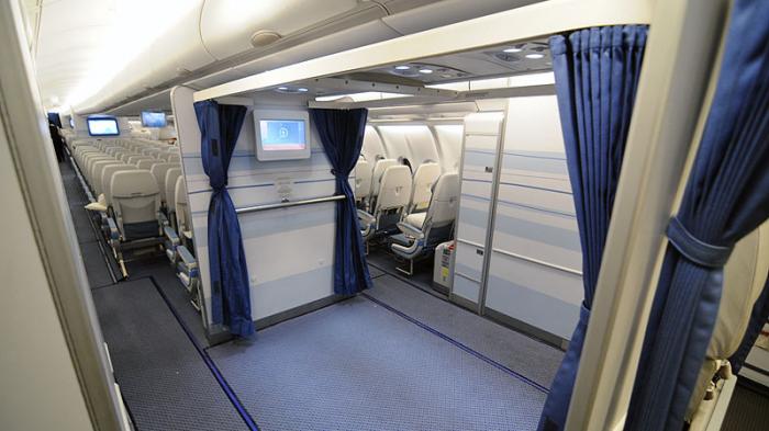 Tempat shalat di pesawat ini disediakan dengan menarik kursi di bagian tengah sehingga menyisakan ruang.