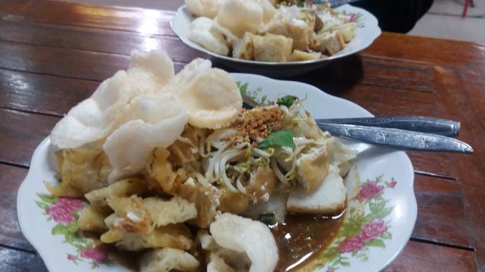 Potongan bakwan goreng, tauge segar, kol yang diiris-iris dan juga sedikit sayuran hijau, tidak ketinggalan adalah kerupuk renyah sebagai paduan dari sajian kupat tahu.
