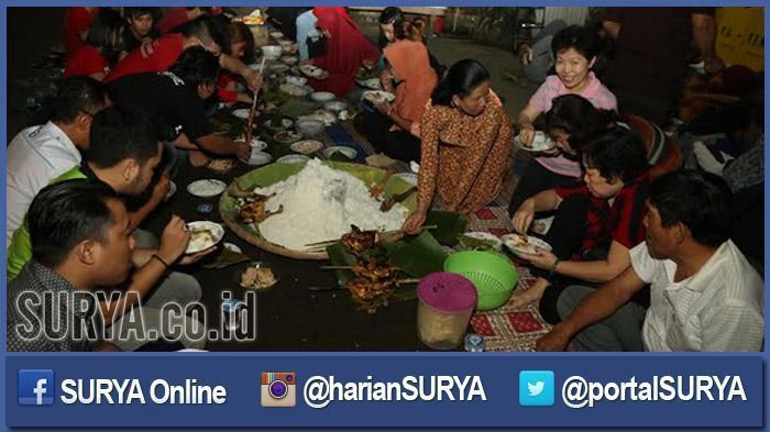 Setelah obor dihidupkan, seluruh warga akan menggelar tumpengnya di depan rumah masing-masing, untuk dimakan bersama-sama.