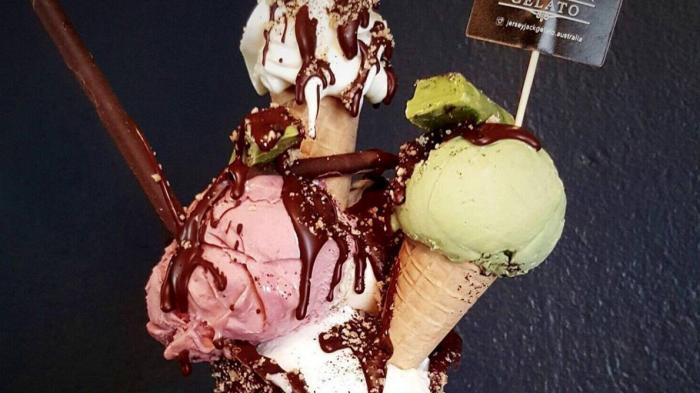 Nah, agar tidak bosan dengan es krim cone yang itu-itu saja, sebuah kedai es krim Jersey Jack Gelato di Corno, Australia membuat satu inovasi es krim unik.