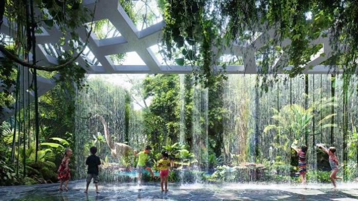 Rencananya, hutan hujan di luar ruangan akan berada di sisi tertinggi tempat hiburan yang menghubungkan hotel dan menara apartemen.