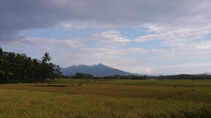Tiba di puncak, saatnya menikmati suguhan alam yang amat indah dengan latar langit luas berhias awan juga pemukiman dan persawahan yang nampak indah dari kejauhan.