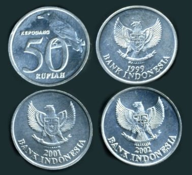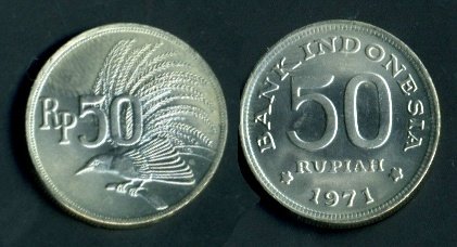 Pada uang logam senilai 50 rupiah ini, bagian depan tampak gambar burung candrawasih sedangkan belakangnya bergambar seperti berikut ini.