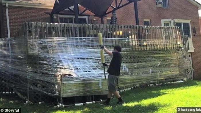 Tak tangung-tangung Jonathan Harchick menghabiskan seribu rol selotip untuk membungkus seluruh bangunan orang tuanya.