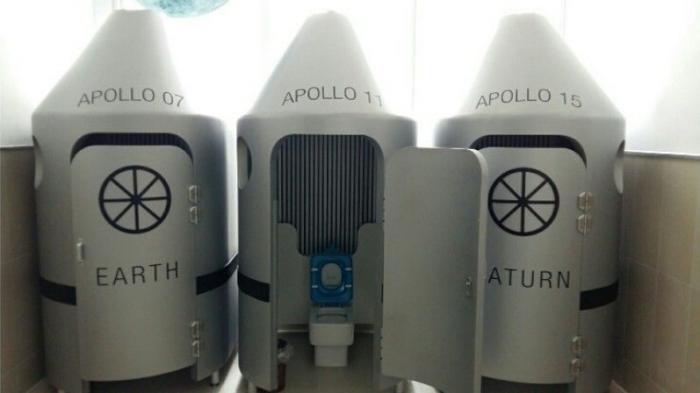 Dengan tema luar angkasa, toilet ini patut diacungi jempol yah.