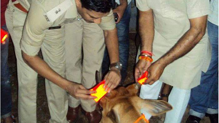 Pemerintah di sana memasang striker Glow In The Dark atau stiker yang bisa memantulkan cahaya di tanduk hewan-hewan warga.