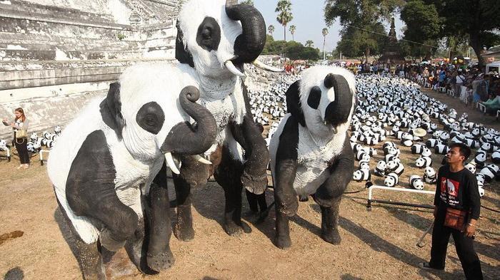 Beberapa waktu lalu, pengelola Lembaga Elephantstay di Royal Elephant Kraai di daerah Ayutthaya, Thailand Selatan melukis tubuh tiga gajah menggunakan cat hingga menyerupai panda.