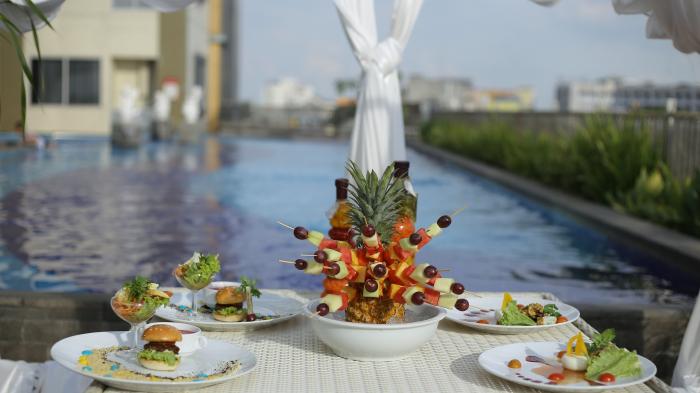 Di hotel ini, kamu bisa menikmati malam minggu dengan bersantai dan menikmati makan malam di pinggir kolam renang yang bernuansa Hawaii, lengkap dengan live music yang akan menghibur.