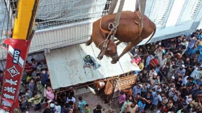 Banteng diturunkan dari lantai empat sebuah rumah atau tempat tinggal di Karachi, Pakistan.