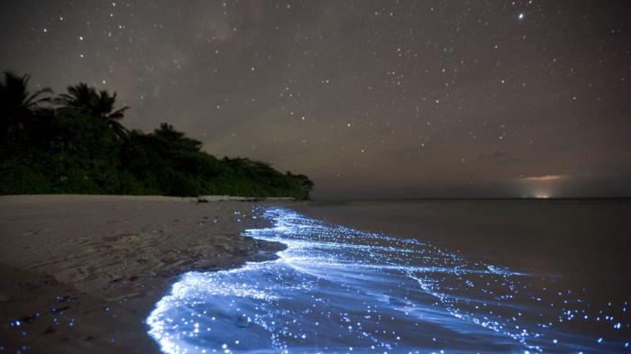 Menurut peneliti ada microba yang membuat ombak di tepi pantai ini terlihat bersinar seperti lampu.