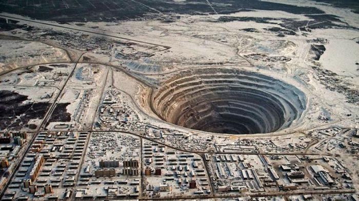 Kawahnya terlihat seperti bekas hantaman meteorit di Mirny, kota terdekat dari galian tambang.