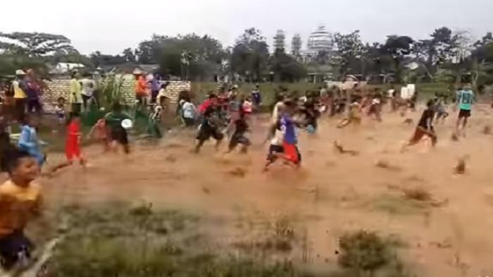 Mereka harus bersusah payah meraba dasar lapangan yang telah dipenuhi lumpur.
