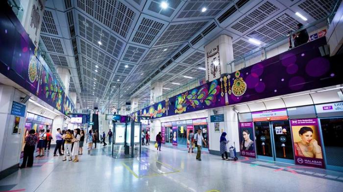 Sederet gerbong, lorong hingga setasiun MRT dihiasi dengan motif India berwarna cerah.
