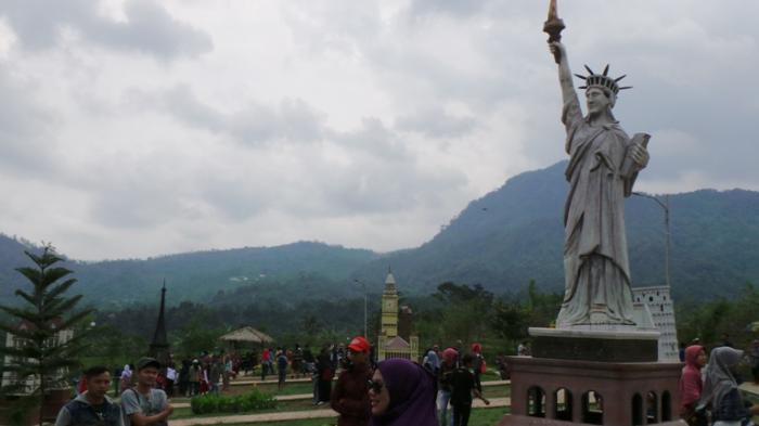 Di lahan terbuka kurang lebih 1,2 hektare itu, puluhan miniatur ikon bangunan dari berbagai negara ditampilkan.