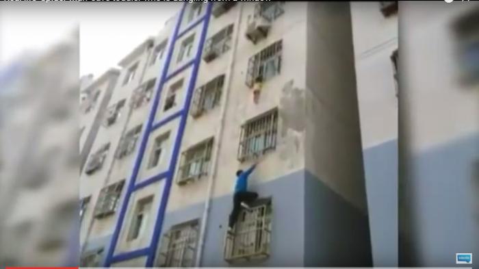 Lei yang melihat anak itu butuh bantuan langsung memanjat gedung lantai tiga dengan tangan kosong.