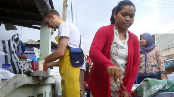 Tapi, ketika memilih tinggal di Indonesia, pria bule ini menjadi pedagang kaki lima dengan berjualan es pisang ijo.