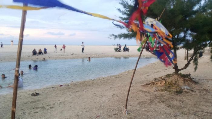 Kejernihan air dan kebersihan di pantai ini tak kalah dengan pantai Kuta di Bali, membuat pengunjung betah bermain di pantai.