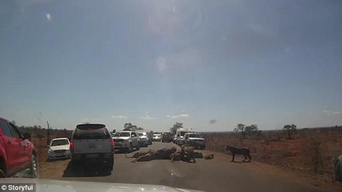 Beberapa ekor singa membawa makanannya ke tengah jalan dan mengadakan pesta seolah tak peduli kemacetan terjadi di sekitarnya.