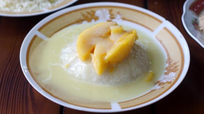 Rasa ketan yang gurih, berpadu begitu pas dengan rasa manis buah durian dan mangga.