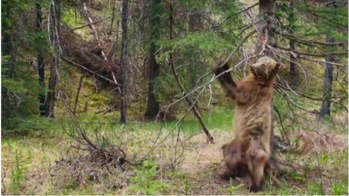 Sementara pada cuplikan lain terlihat seekor beruang malah keasyikan sehingga mirip dengan penari tiang.