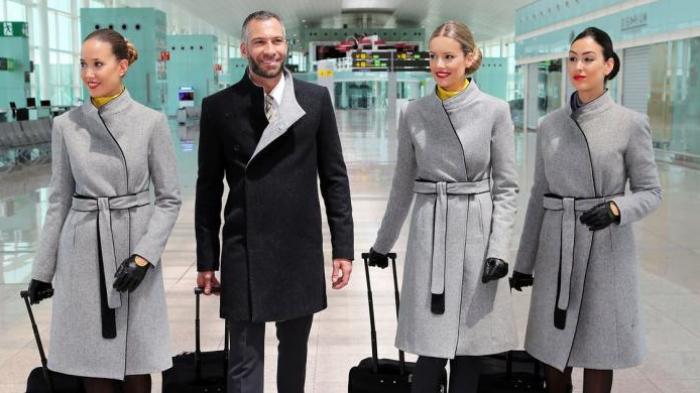 Para pramugari Vueling Airlines menggunakan coat warna abu-abu terang lengkap dengan sarung tangan dan sepatu hitam dove.