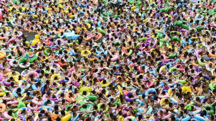 Bukan lagi kolam air, tapi kolam renang ini justru mirip lautan manusia.