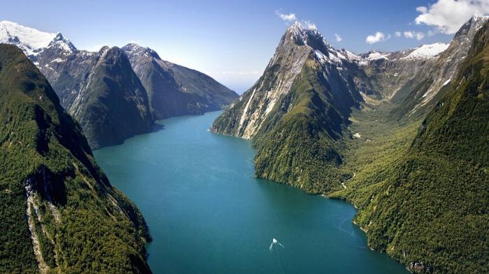 Masuk wilayah Fiordland National Park, terdapat pemandangan danau dan tebing-tebing tinggi yang dihiasi air terjun di sisi-sisinya.