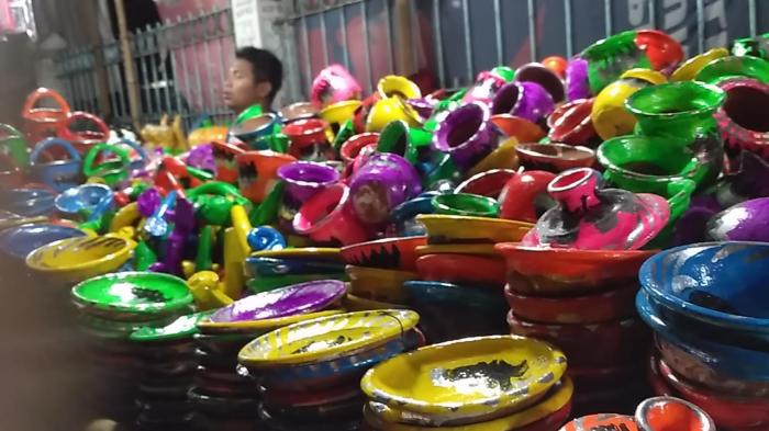 Yanto menjual aneka kerajinan gerabah dalam bentuk mainan aneka bentuk aneka warna.