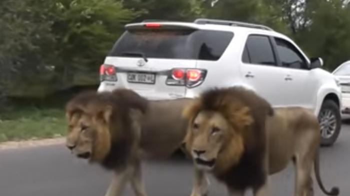 Dalam video yang diunggah ke YouTube oleh akun Kruger National Park, terlihat dua binatang perkasa dengan surai anggun itu berjalan pelan di tengah gelombang kendaraan yang melintas.