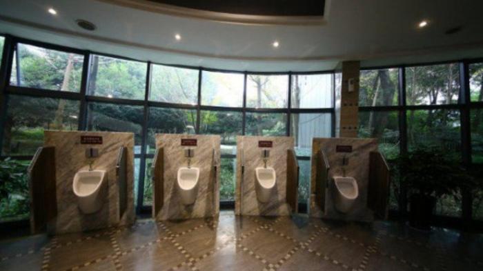 Nggak cukup sampai di situ, bagian paling mengesankan dari toilet umum berkelas ini adalah dinding kaca yang memungkinkan pengunjung menyaksikan tanaman hijau di luar, saat mereka sedang buang air.