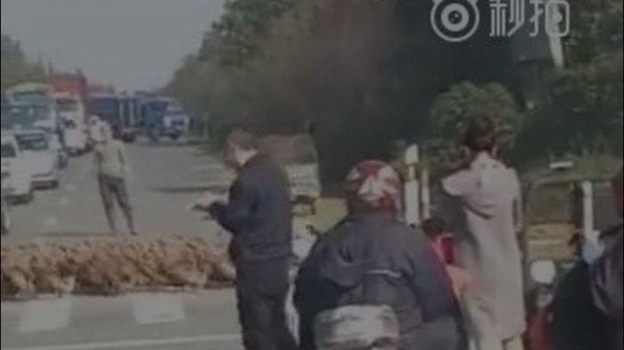 Bagaimana suasana ketika bebek menyeberang jalan tergambar jelas dalam sebuah video yang ditayangkan People's Daily China, Minggu (4/12/2016).