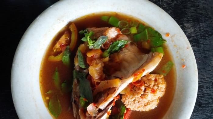 Genangan kuahnya merah kuning kecokelatan ditambah irisan tomat, daun bawang, potongan nanas, serta cabai merah yang ditumbuk kasar terlihat menggoda.