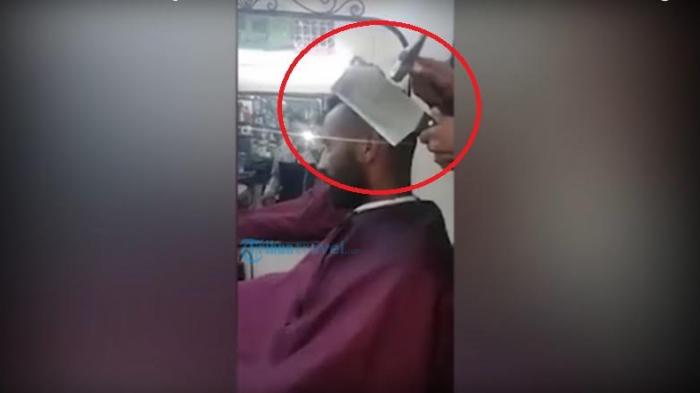 Dalam video tersebut terlihat seorang pelanggan tidak ketakutan sama sekali saat tukang cukur merapikan rambutnya.