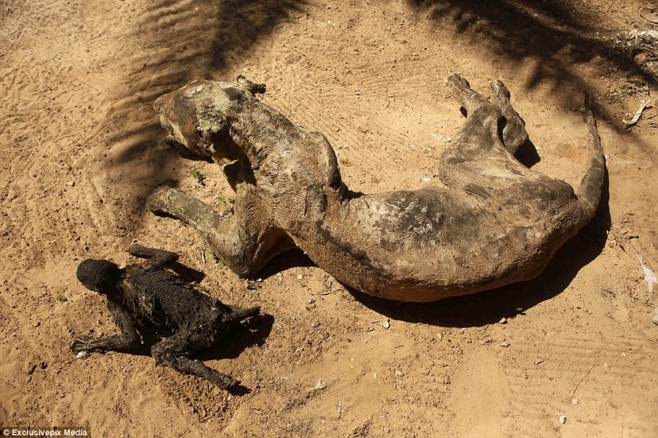 Dalam foto-foto itu, tampak puluhan hewan, seperti harimau, monyet, dan buaya, dibiarkan tewas kelaparan hingga menjadi mumi.